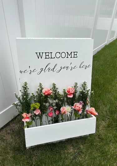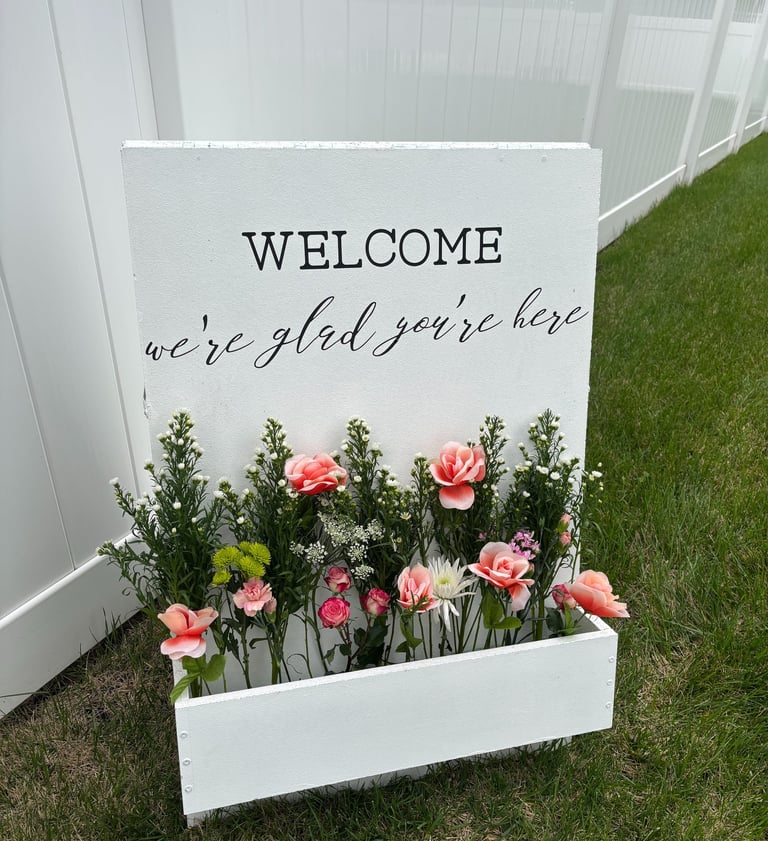 Bundle our sweet cart and flowerbox welcome sign for $275. This deal includes custom lettering on both items. The flower sign includes fresh flowers.