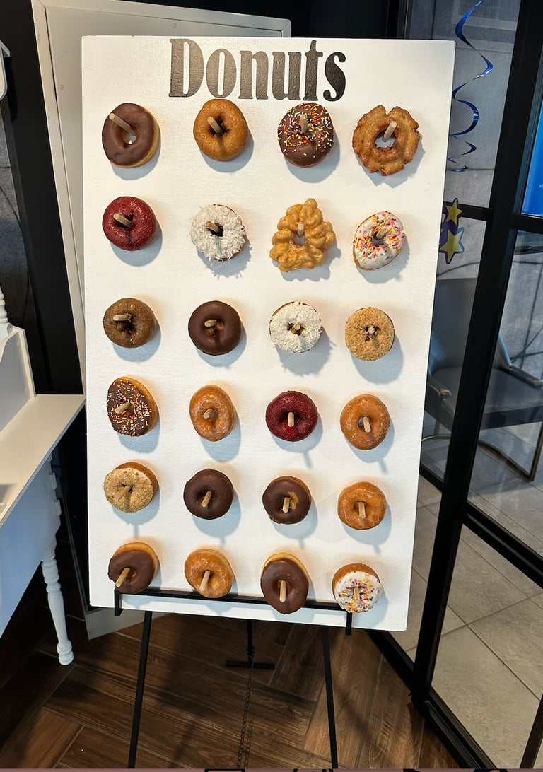 Our Donut Wall boasts 24 pegs, offering the flexibility to display either 24 or 48 donuts—simply choose to adorn each peg with one or two donuts.